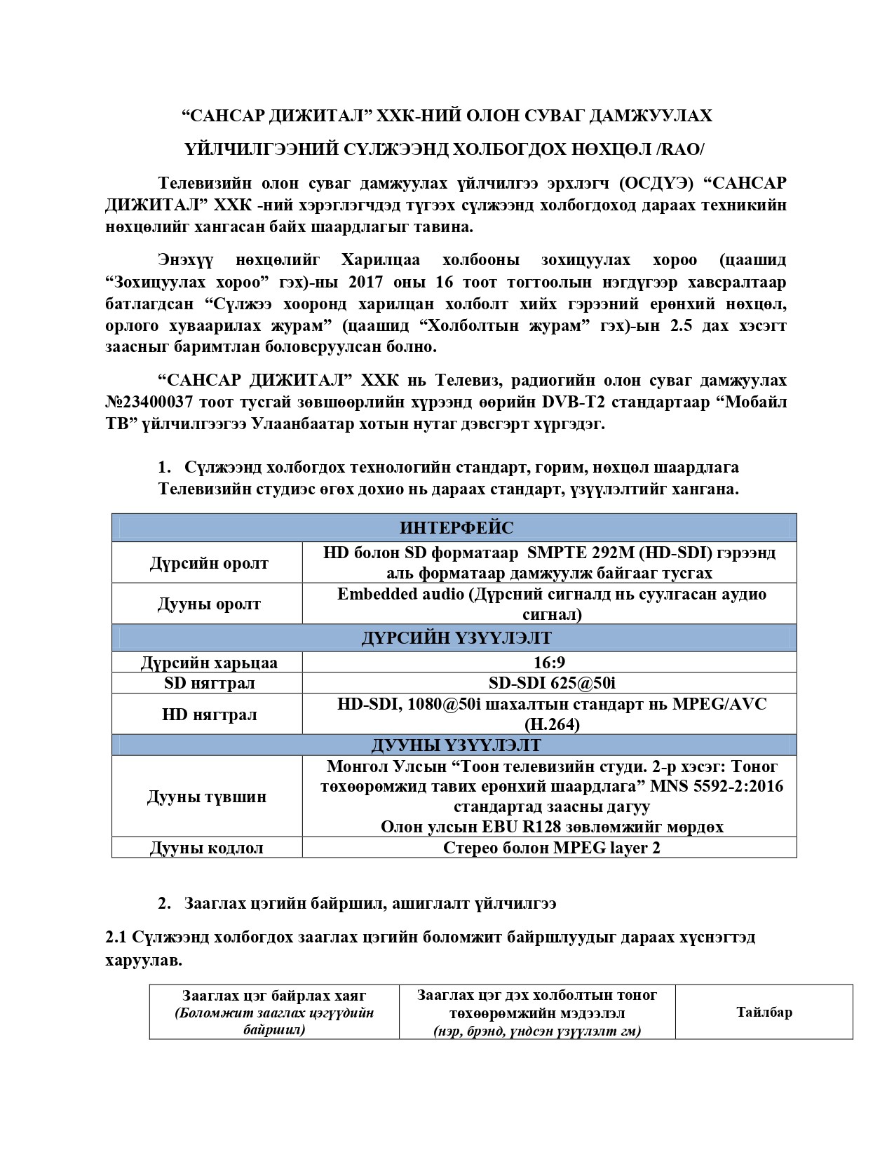 Сансар Дижитал ХХК-н олон суваг дамжуулах үйлчилгээний сүлжээнд холбогдох нөхцөл /RAO/